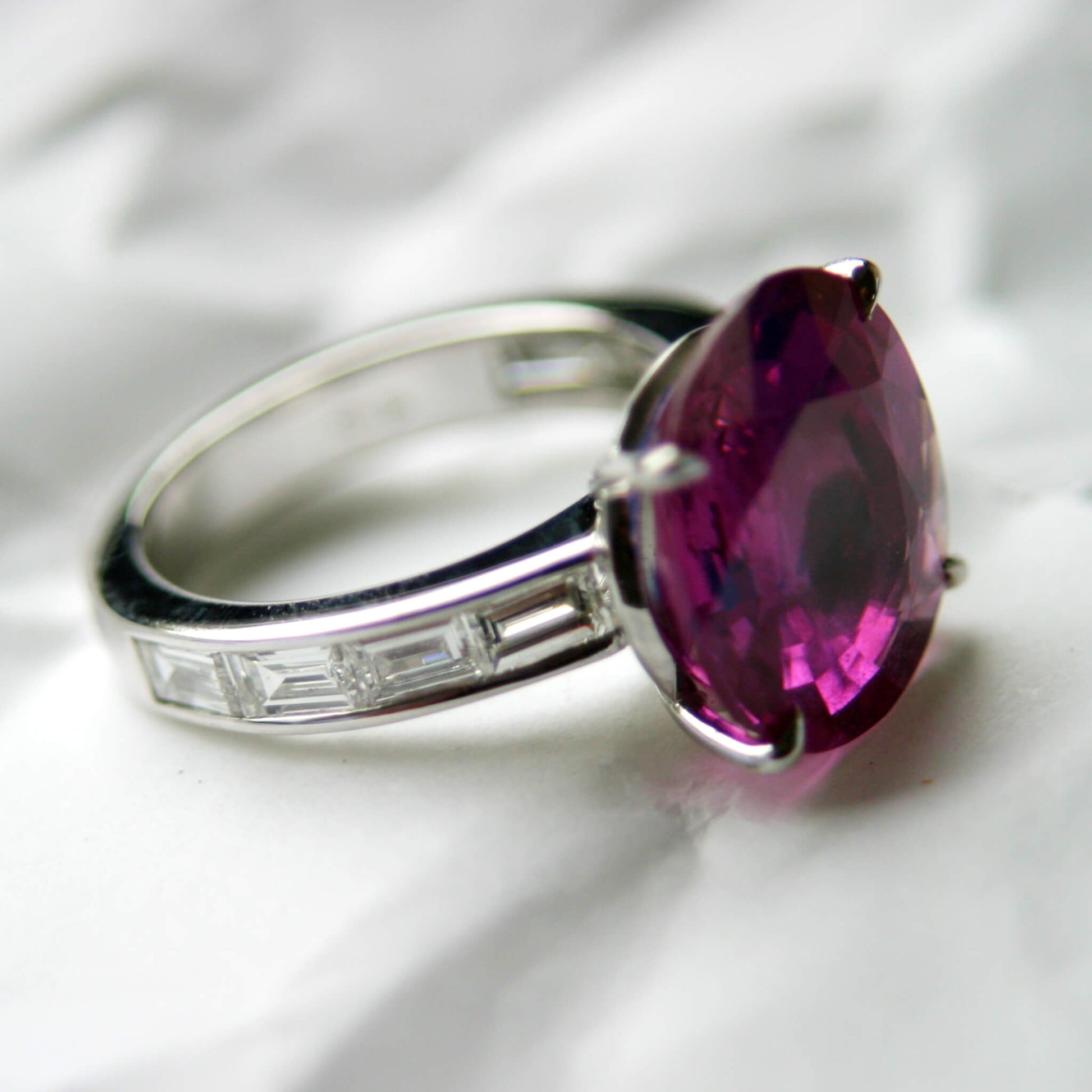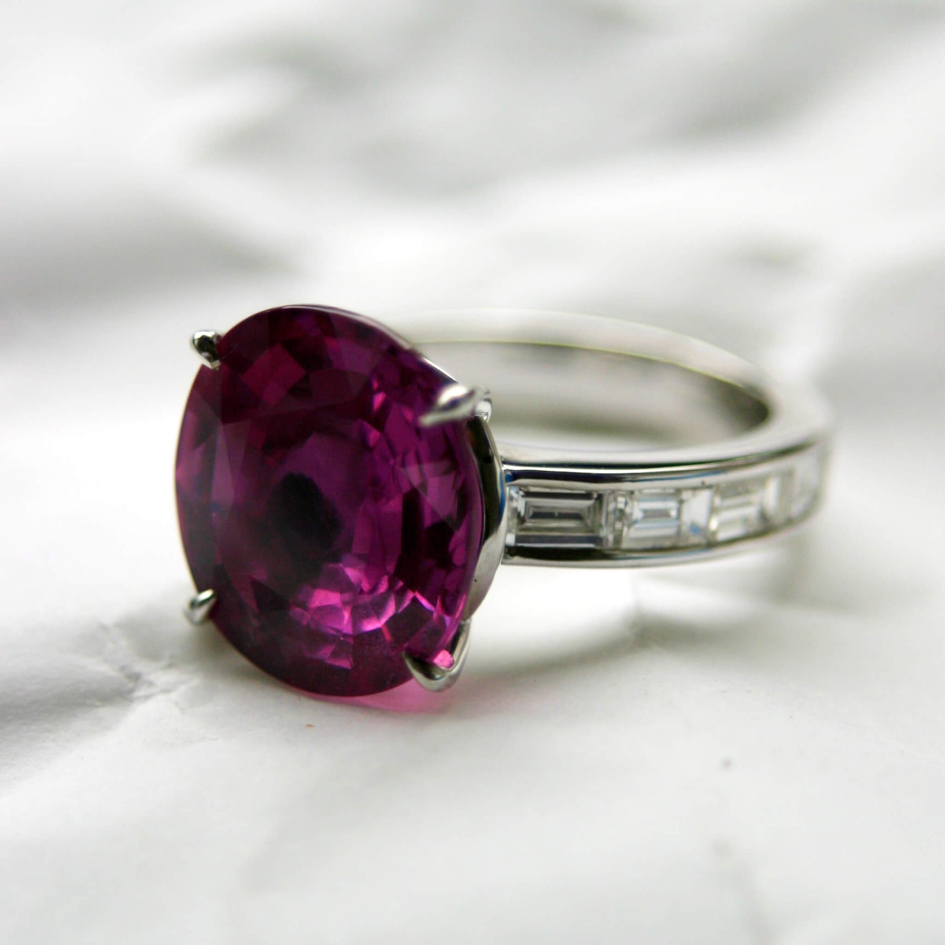 This striking ring features a vibrant solitaire ruby as its centerpiece, renowned for its rich red hue and captivating depth. The band is elegantly accented with precisely cut baguette diamonds, adding a linear sparkle that perfectly complements the ruby’s bold color.