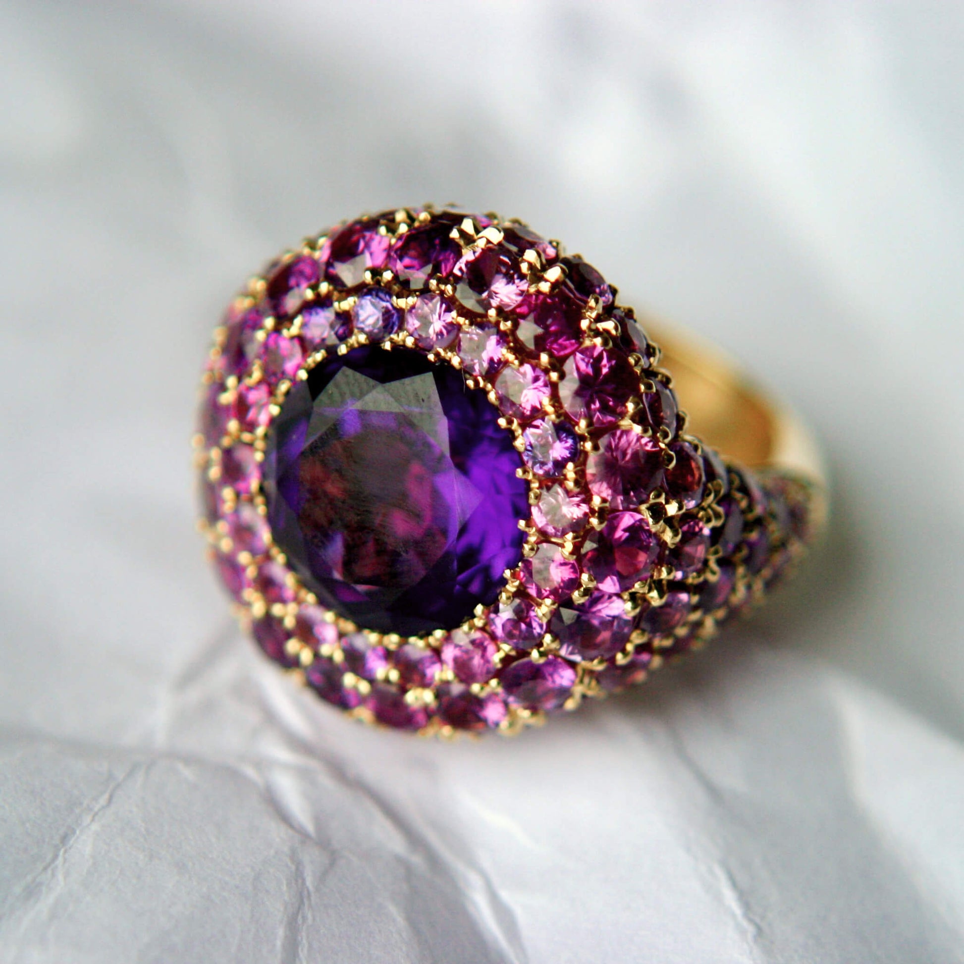 Yellow Gold Bombé Solitaire Amethyst with Brilliant-Cut Amethyst Accents