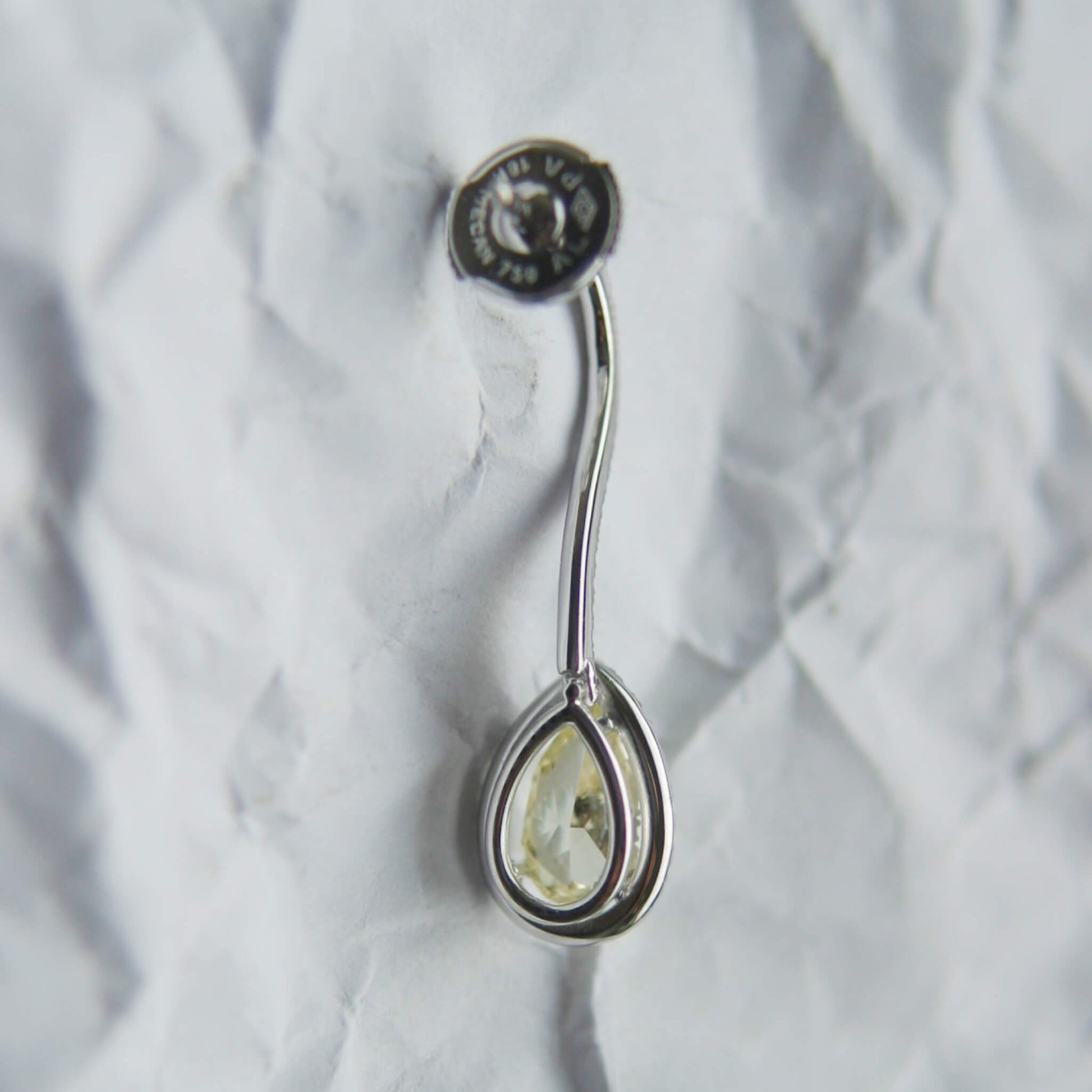 These exquisite earrings feature radiant yellow pear-shaped diamonds elegantly suspended as pendants. Each centerpiece is framed by a delicate contour of brilliant-cut white diamonds, enhancing the vivid color and adding captivating sparkle. Crafted with meticulous attention to detail, these earrings offer a luxurious blend of bold color and timeless brilliance.